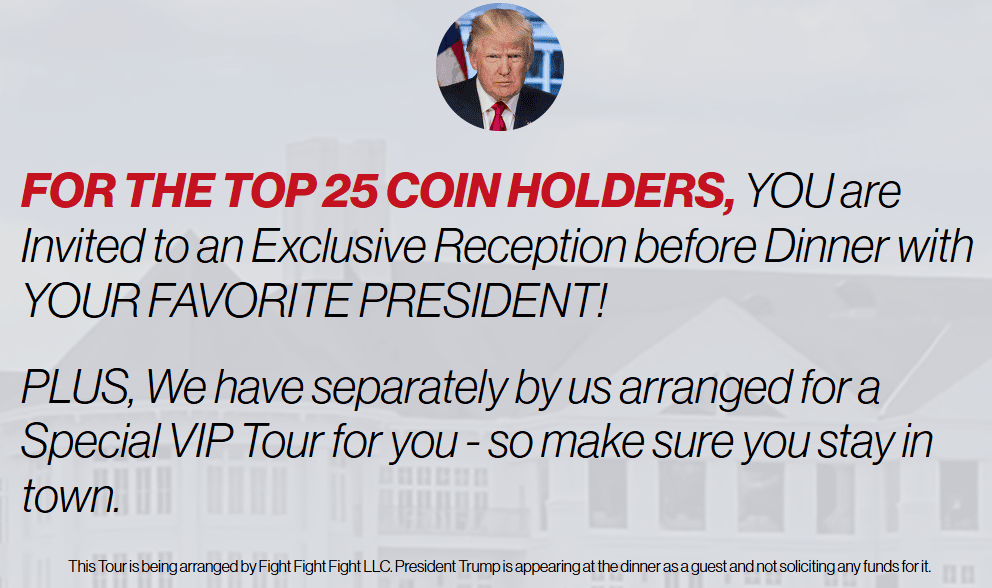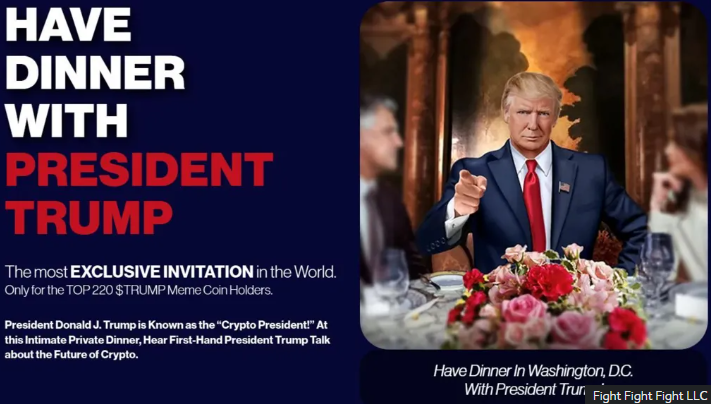 Σύμφωνα με την επίσημη ιστοσελίδα του meme coin $Trump, οι 220 κορυφαίοι κάτοχοι του νομίσματος θα λάβουν πρόσκληση για ένα ιδιωτικό εορταστικό δείπνο με τον πρόεδρο στις 22 Μαΐου, που θα διεξαχθεί στην Εθνική Λέσχη Γκολφ Τραμπ στην Ουάσιγκτον. Το γεγονός χαρακτηρίζεται ως «η πιο ΑΠΟΚΛΕΙΣΤΙΚΗ ΠΡΟΣΚΛΗΣΗ στον κόσμο».